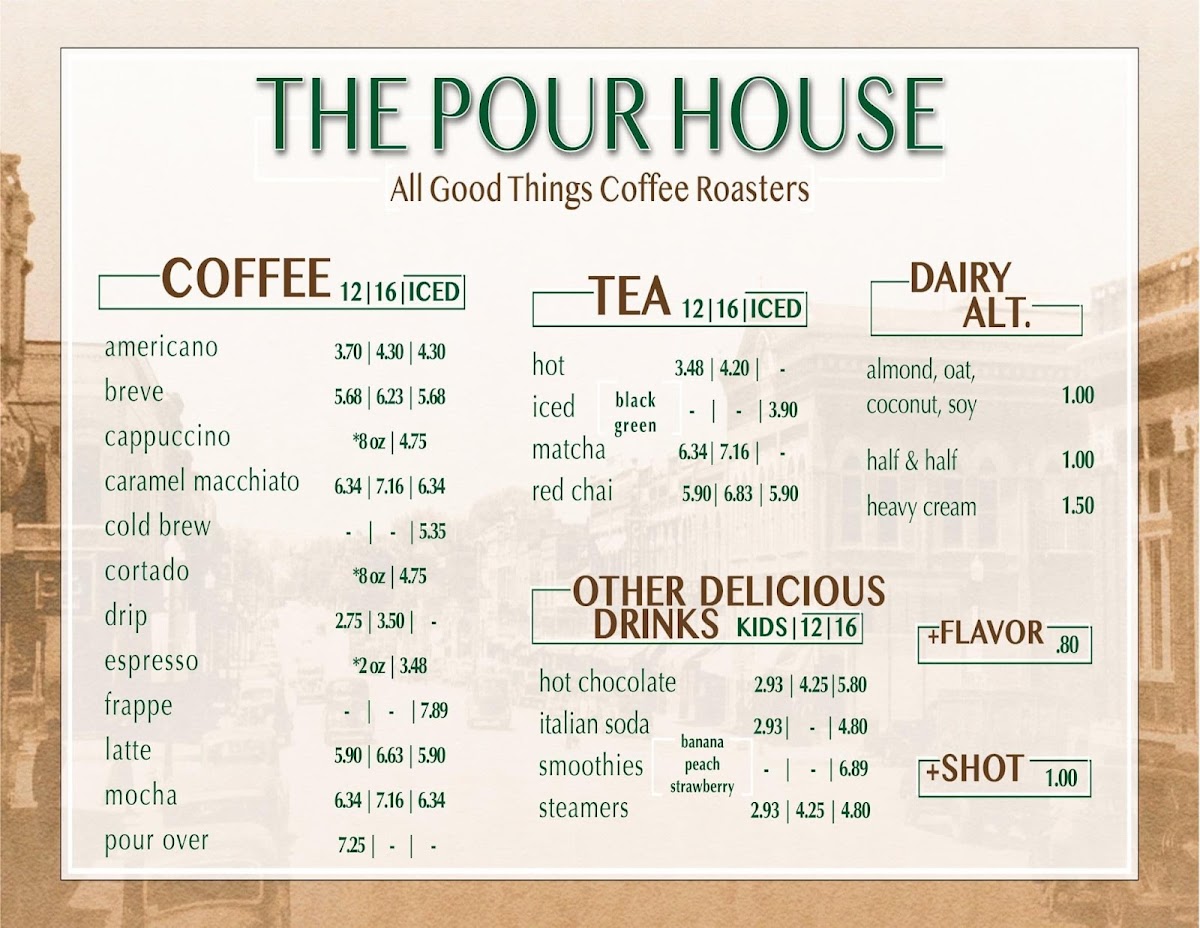 Each item reflects quality and creativity, inviting you to linger and savor. The Pour House Coffee Shop isn’t just a stop; it’s a destination for whimsical flavors and comforting vibes.